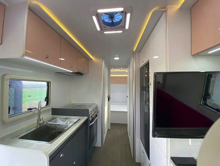●Our motor homes caravan RV has all the necessary decorations inside. Such as DVD, TV, slide out kitchen, folding seats, washing machine and water-tap, washroom, Exhaust fan, bed, cabinet, refrigerator, Awnings, air conditional, etc.